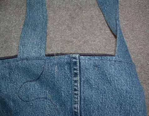 Insert the finished lining inside the denim bag shell. Pin and hand sew the lining inside as shown.