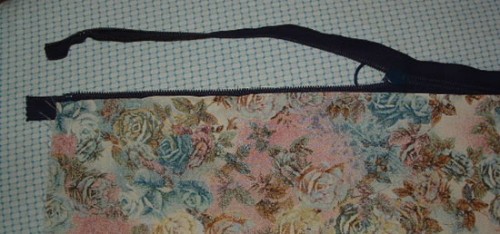 Pin zipper to lining as shown. My zipper was a bit long but don’t worry, you can just hide the long end inside the bag once it’s sewn inside the denim shell.