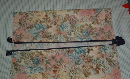Lining with 14″ zipper. Remember the right side of fabric will be on the inside so you can insert it into the finished denim bag shell.