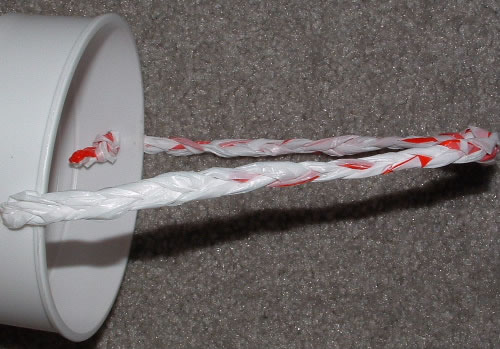Using the three strands, braid or chain the plastic bag yarn together. Once you have braided the plastic bag yarn together, insert the loose end from the outside of the cup to the inside. Tie a knot on the inside to secure your hanger.