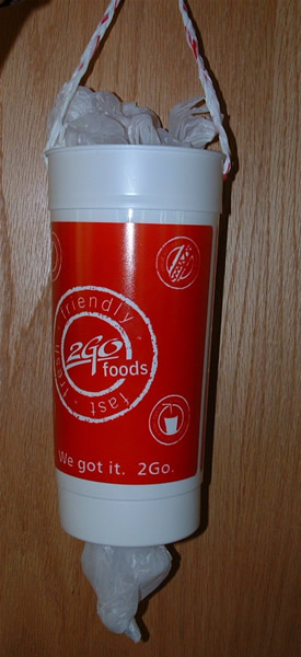 This cup had a pre-formed 2″ circular bottom which is just right for the opening for your plastic bags. Cut the bottom of the cup around as marked.