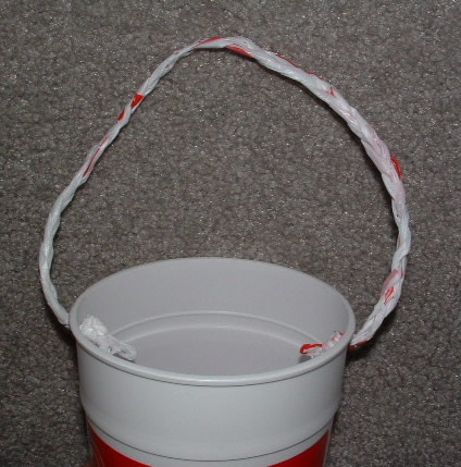 I cut 3 plastic bag loops about 1 inch wide. This is the same method of cutting strips that I use when making plastic bag yarn. Here is a link to show how to cut the plastic bag into loops. Hold the 3 loop strips together and thread it from the outside of the cup to the inside. Make sure you keep your strands flat and evenly held together. Tie a knot at the end of the plastic to secure it on the inside of the cup.
