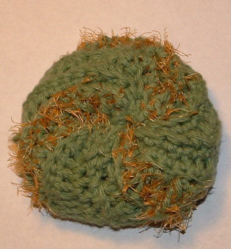 Here is another scrubbie I crocheted using one of those plastic nets that they put around a ham. The ham netting is much thicker and harder to crochet with. I had to cut the ham netting into wider strips of about 1-1/2 to 2 inches wide otherwise I couldn’t connect the cut links. The lettuce sleeves are much softer and easier to crochet with. But the ham netting does make for a very good and stiff scrubber. I crocheted only three times the 2-row sets using the gold colored ham netting to complete this scrubbie.