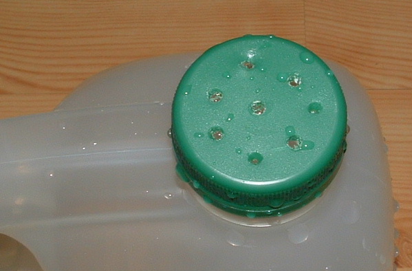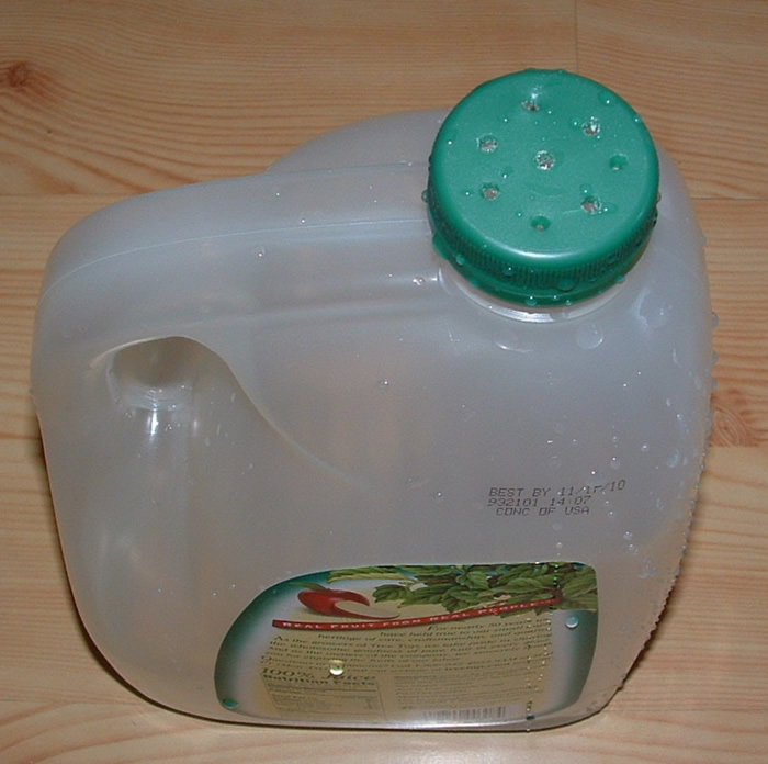 You just need a plastic jug with a screw off lid. I like the one gallon Tree Top apple jugs as they are made with heavy plastic and a sturdy screw off cap. I used a hammer and a nail to punch the holes around the top of the cap as shown. Just put the cap on a old board and hammer the nail through the plastic to create your watering holes.