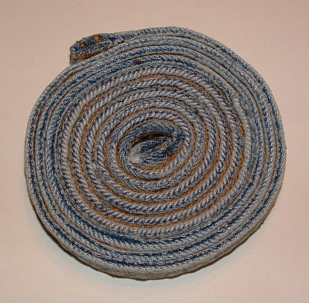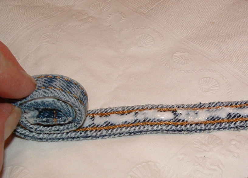 I just love recycling denim and had to try this craft project. I used two inside hems from a pair of old jeans to create my coaster. Trim the edges very close and evenly with a pair of sharp scissors.