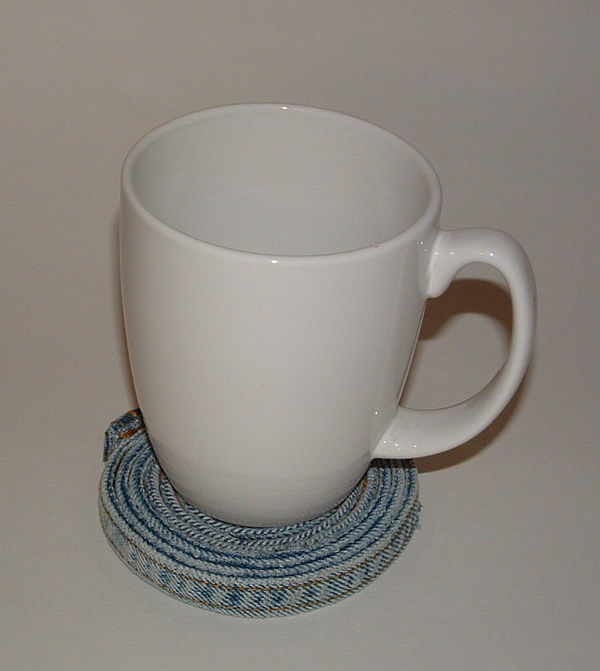 Here is my finished denim coaster. It measures about 4 inches wide. I left the bottom hem end on it as I thought it added character. You could cut it off or add another hem strip to make your coaster larger as desired. Now I’m ready to go out and enjoy a hot cup of coffee using my new recycled denim coaster.