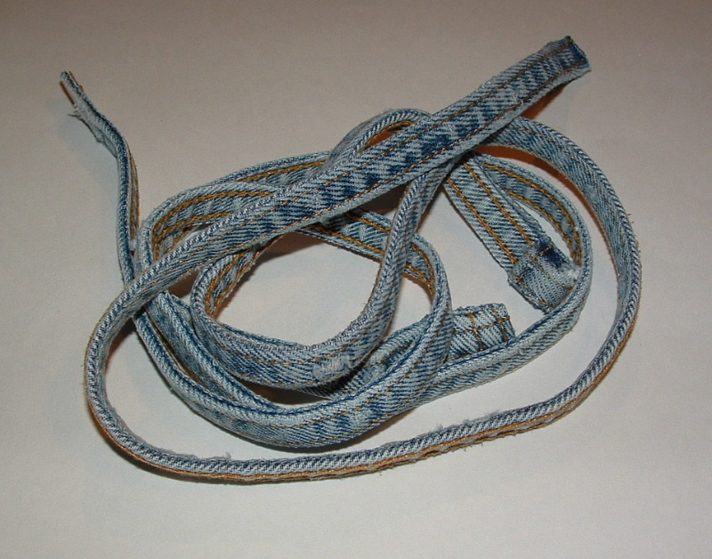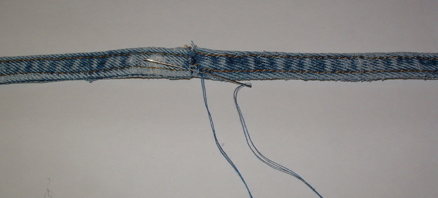 Next I spliced my two hem strips together with a thread and needle. Just do a few hidden slip stitches to secure your two denim pieces together. You can click on any of the photos to supersize them.