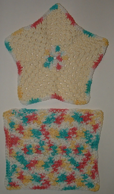 The double-thick diagonally crocheted potholder uses this free pattern. I chain 34 to start which creates a finished potholder about 6.5 inches wide.