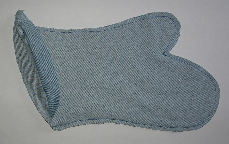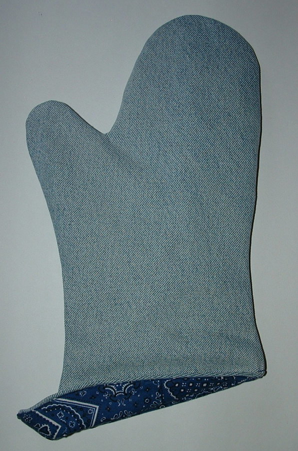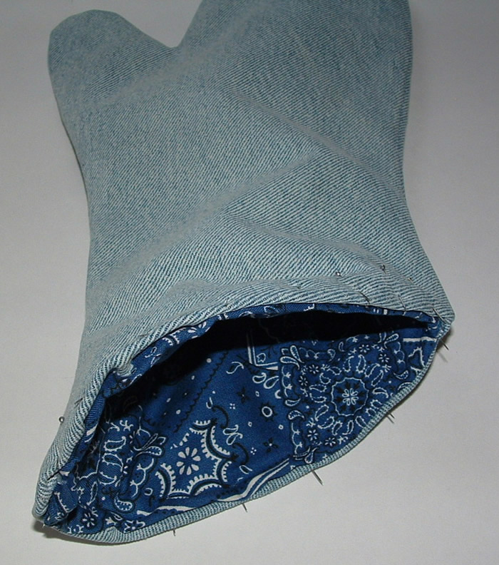 Because denim is so hard to machine sew through several layers, I assembled my oven mitt in two pieces. First pin the two denim panels together with right sides together. Machine sew the two denim panels together using a narrow hem around the mitt. Leave the end hem unfinished at this point. Trim curves and clip at thumb turn. Turn wrong sides to the inside. Using a pencil’s eraser end, push out the thumb and edges. Press with hot iron and turn under a narrow hem along the unfinished edge of the denim mitt shell.