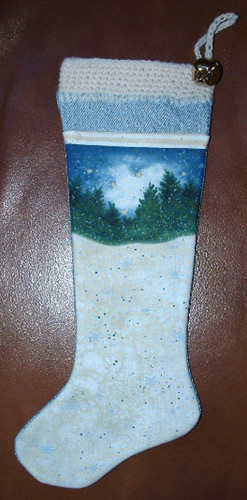 Craft a recycled denim Christmas stocking this holiday. I used a pant leg of some old jeans and a printed stocking panel to make this unique Christmas stocking. I then topped it off with a crocheted top edge and a jingle bell.