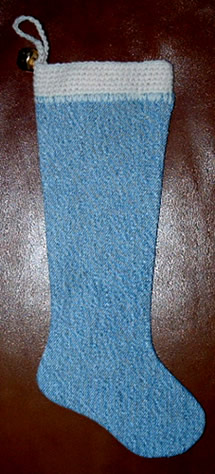 Put the right sides together and machine stitch a narrow seam around the sock. Leave the top edge unsewn as you will fold in the top edge about 2 inches to create a finished edge without having to sew along the top opening. The crocheted top and loop is then added to the top edge of the denim stocking.
